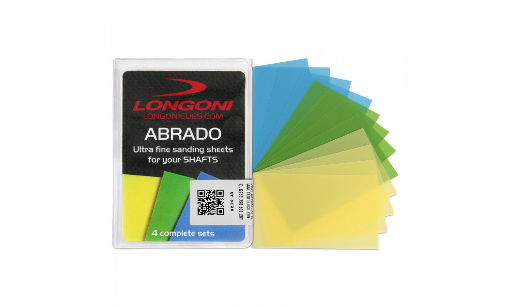 Набор микробумаги для полировки кия Longoni Abrado состоит из 12 листов различных видов зернистости, по 4 шт на каждый вид. Абразивные поверхности отличаются по жесткости и подбираются в зависимости от степени загрязнения в процессе чистки и полировки кия.